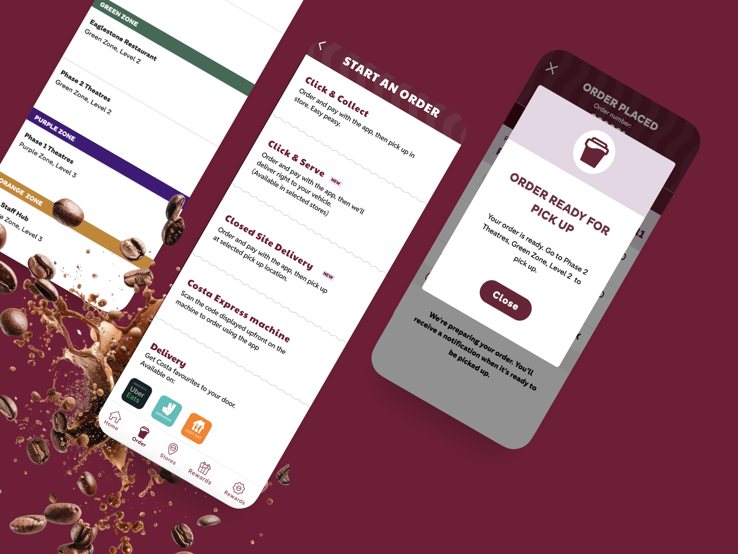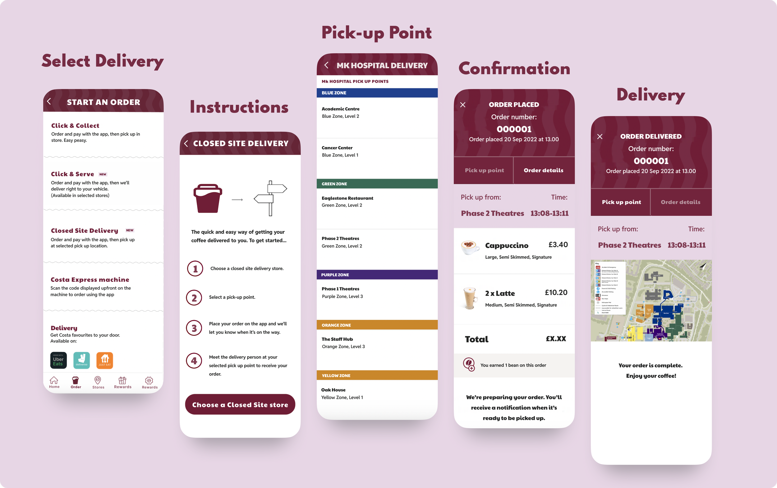 As part of Costa’s “Coffee to You” growth initiative, I led the UX design for a Closed Site Delivery concept — a mobile ordering feature tailored for hospital environments. The goal was to pilot a service that let hospital staff, patients, and visitors get Costa delivered directly to them on site. This trial run wasn’t launched but was a real-world opportunity to shape a potential new digital revenue stream, targeting untapped NHS sites with high footfall and demand.